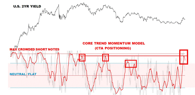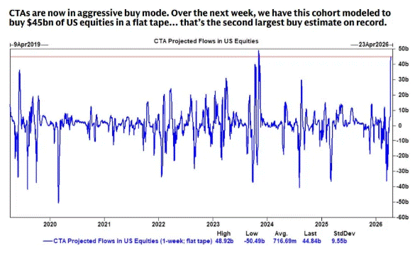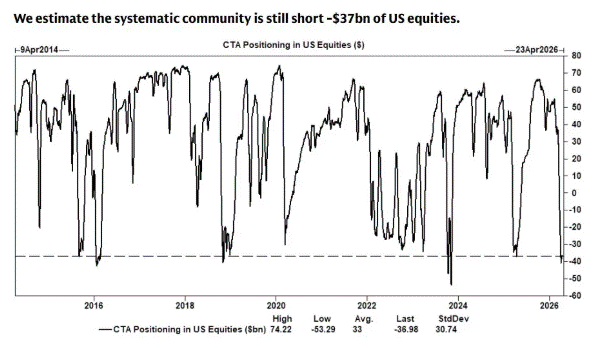 Pero lo más llamativo viene del posicionamiento de los fondos sistemáticos (los CTAs, que siguen tendencias de forma mecánica). Están actualmente en posición corta extrema en renta variable americana: algo así como -37.000 millones de dólares en exposición neta.