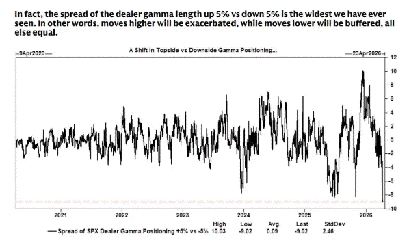 A eso se suma otro dato técnico poco comentado pero muy relevante. La asimetría de gamma de los dealers de opciones está en el nivel más extremo jamás registrado. En términos prácticos: los movimientos al alza se amplifican (los dealers tienen que comprar cuando el mercado sube para cubrir su posición) y los movimientos a la baja se amortiguan (compran también cuando cae). El mercado tiene, en este momento, una especie de airbag estructural instalado.