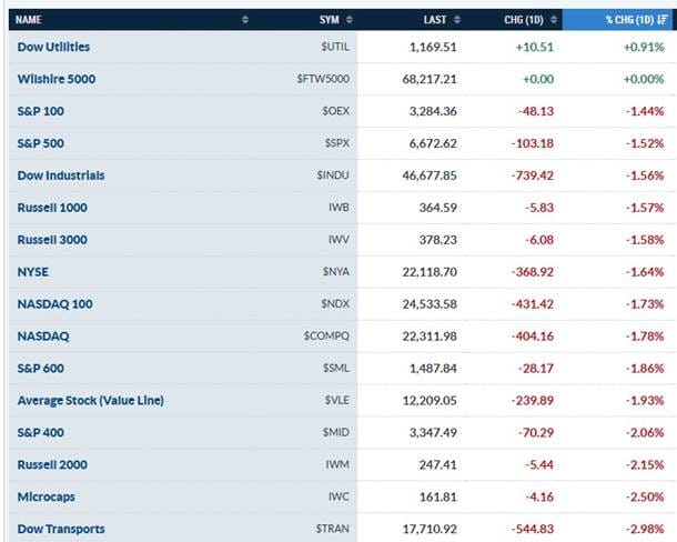 Por sectores, los únicos en verde fueron Energía (+0,93%) y Utilities (+0,71%). Todo lo cíclico sufrió: Industriales cayeron un -2,51% (su peor día desde abril), Consumo Discrecional un -2,30% y Tecnología un -1,84%. Los Financieros bajaron un -1,62%, arrastrados por el miedo al crédito privado del que os hablo un poco más abajo. Ojo también al Consumo Básico, que casi no se movió (+0,09%): el único gigante en verde dentro del sector fue Walmart (+1,5%), que como siempre actúa de refugio cuando el consumidor se pone nervioso.