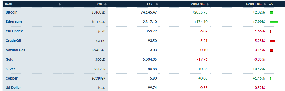 En materias primas, el oro cayó un 0,88% hasta 5.017 dólares, en una toma de beneficios tras el rally de refugio. El cobre subió alrededor de un 1,30% hasta 5,11, apoyado por la resistencia de la demanda vinculada a centros de datos. Y el gas natural bajó un 3,35% hasta 3,03 dólares, debilitado por las expectativas de reapertura de rutas. En cripto, Bitcoin subió un 3,04% hasta 73.920 dólares. Técnicamente está presionando la parte alta de su rango mensual de consolidación, y un cierre sostenido por encima de 74.000 dólares podría abrir la puerta a un nuevo tramo alcista.