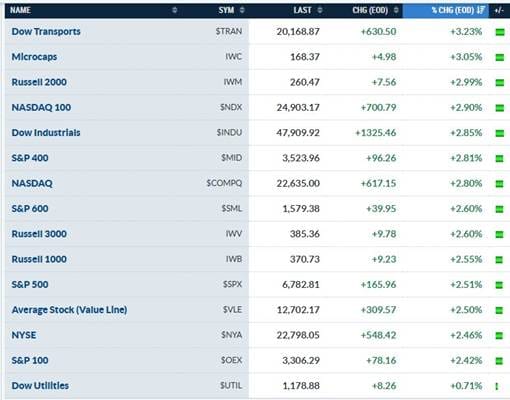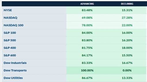 La amplitud fue extraordinaria. En el S&P 500, el 83,80% de los valores subió y solo el 16,20% bajo. En el NYSE, el ratio fue 83,48% avanzando. El Dow Transports cerro con el 100% de sus componentes en positivo, cero en negativo. Hay que buscar mucho para encontrar una sesión con amplitud más limpia que esta. Dentro del S&P 500, 220 componentes (el 45%) subieron más de un 3%, el mejor dato del ano.