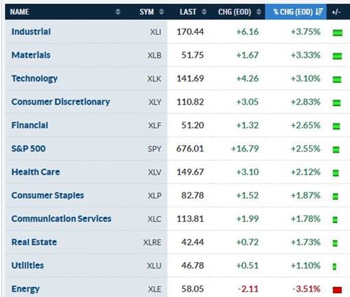 Por sectores, Industriales lidero con un +3,75% (mejor sesión desde abril de 2025), Materiales +3,33%, Tecnología (XLK) +3,10%, Consumo Discrecional +2,83%, Financieros (XLF) +2,65%. El único sector en rojo fue Energía (XLE) -3,51%: la cara opuesta lógica de la tregua.