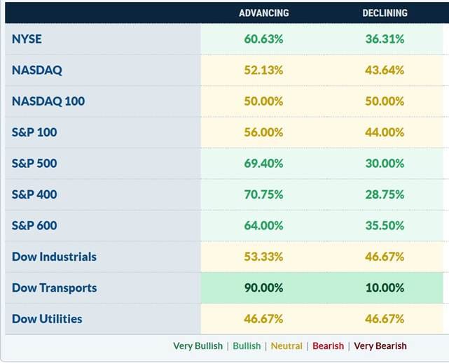 La amplitud de mercado fue el dato tranquilizador de la jornada. En el S&P 500, el 69,4% de los valores avanzó durante la sesión, dato que contrasta favorablemente con el −0,54% del índice ponderado. En la NYSE, el 60,6% de los valores cerró en positivo. El Dow Transports fue el índice más alcista del día con un +2,14%, con el 90% de sus componentes avanzando, señal de que la economía real sigue funcionando con normalidad.